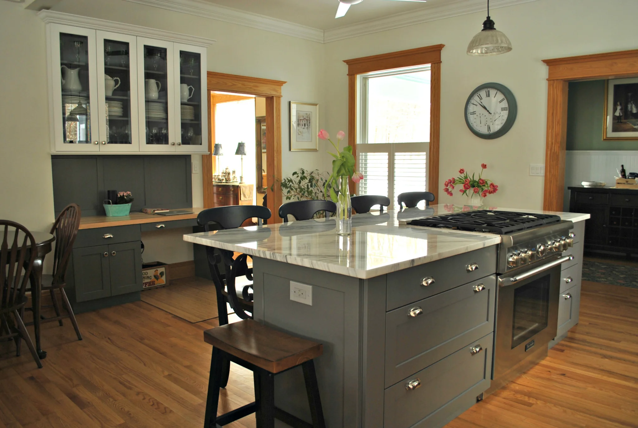 In the kitchen, a combination of colors from Brookhaven cabinets were chosen. "Bright White" painted cabinets were used for the uppers and "Slate" for the lower cabinets and island. Carrara Marble countertops give the kitchen a touch of elegance.